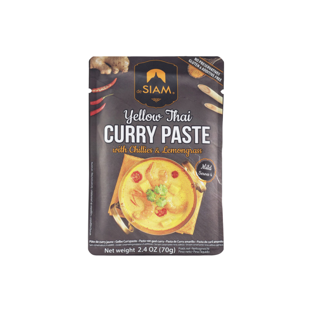 Zutaten: Sonnenblumenöl, gelbe Curry-Gewürzzubereitung (SENF, Bockshornkleesamen, Koriandersamen, Pfeffer, Farbstoff: Paprika, Kümmelsamen, Zimtstangen) 16%, Schalotten, Zitronengras 10,00%, Knoblauch, Rote Chili 9%, Salz, Kokoszucker, Galgant 2,7% Korianderwurzeln, Ingwerwurzeln, Kaffir-Limetten Schale 0,5%, Limettensaft, Weißer Pfeffer. |