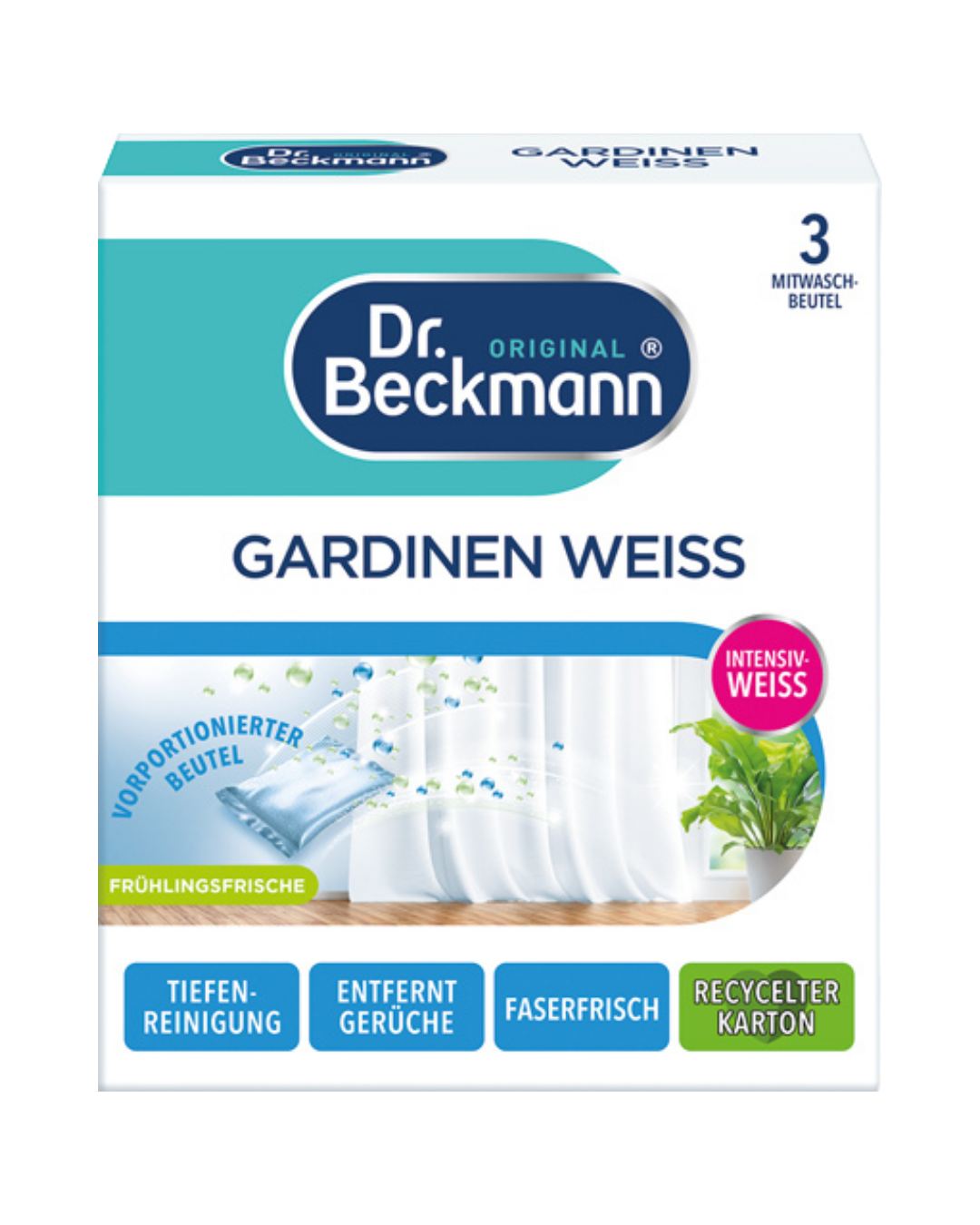 Dr. Beckmann Gardinen Weiss Intensives Weiss & Faserfrische# Ihre Gardinen werden fasertief rein und strahlend weiss mit einem angenehmen Duft für ein spürbares Frischeerlebnis.