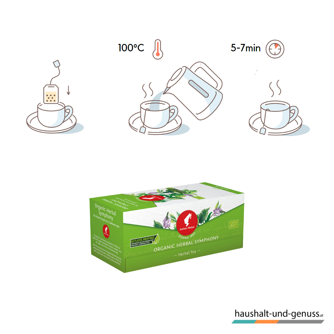 Mit Julius Meinl Tee Kräuter Symphonie erhalten Sie eine köstliche Kräuterteemischung, die aus hochwertigen Zutaten hergestellt wird. Der Tee enthält zum Beispiel Zitronenverbene, Melisse und Pfefferminze, die alle für ihre heilenden und wohltuenden Eigenschaften bekannt sind. Die 25 Teebeutel im Kuvert sind hygienisch und praktisch verpackt und eignen sich perfekt für unterwegs. 1 Teebeutel entspricht einer Tasse Tee.