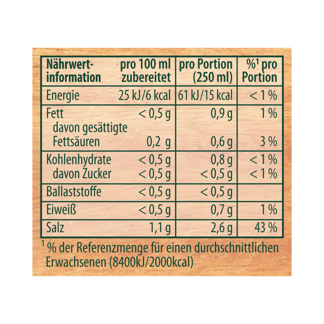 Energie Ungefährer Wert (~) 6 Kilokalorie Energie Ungefährer Wert (~) 25 Kilojoule Fett Kleiner als (<) zu klein für genaue Messung (Regel: <0.5) 0,5 Gramm davon gesättigte Fettsäuren Ungefährer Wert (~) 0,2 Gramm Kohlenhydrate Kleiner als (<) zu klein für genaue Messung (Regel: <0.5) 0,5 Gramm davon Zucker Kleiner als (<) zu klein für genaue Messung (Regel: <0.5) 0,5 Gramm Ballaststoffe Kleiner als (<) zu klein für genaue Messung (Regel: <0.5) 0,5 Gramm Eiweiß Kleiner als (<) zu klein für genaue Messung (Regel: <0.5) 0,5 Gramm Salz Ungefährer Wert (~) 1,1 Gramm