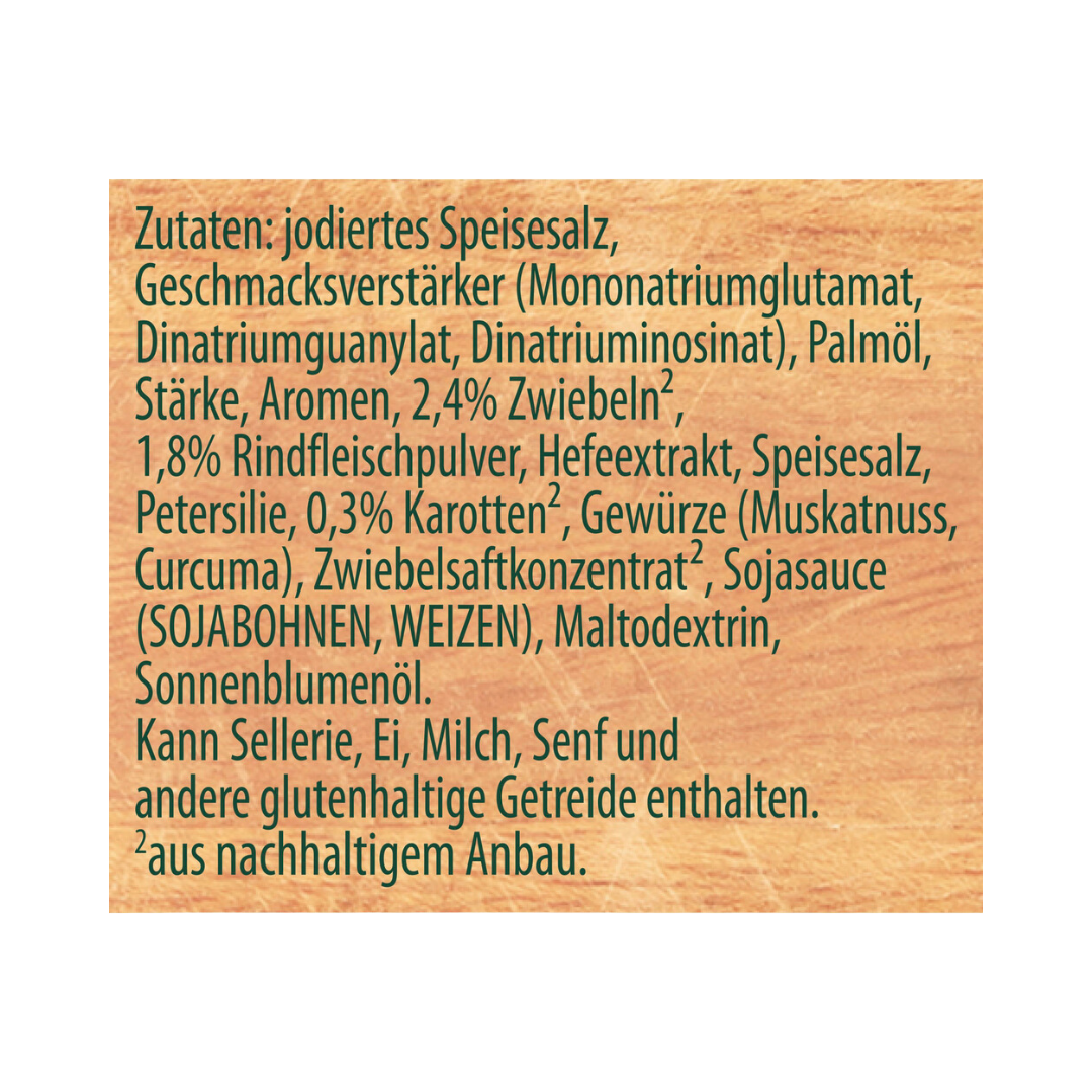 jodiertes Speisesalz, Geschmacksverstärker (Mononatriumglutamat, Dinatriumguanylat, Dinatriuminosinat), Palmöl, Stärke, Aromen, 2,4% Zwiebeln², 1,8% Rindfleischpulver, Hefeextrakt, Speisesalz, Petersilie, 0,3% Karotten², Gewürze (Muskatnuss, Curcuma), Zwiebelsaftkonzentrat², Sojasauce (SOJABOHNEN, WEIZEN), Maltodextrin, Sonnenblumenöl. Kann Sellerie, Ei, Milch, Senf und andere glutenhaltige Getreide enthalten. ²aus nachhaltigem Anbau.