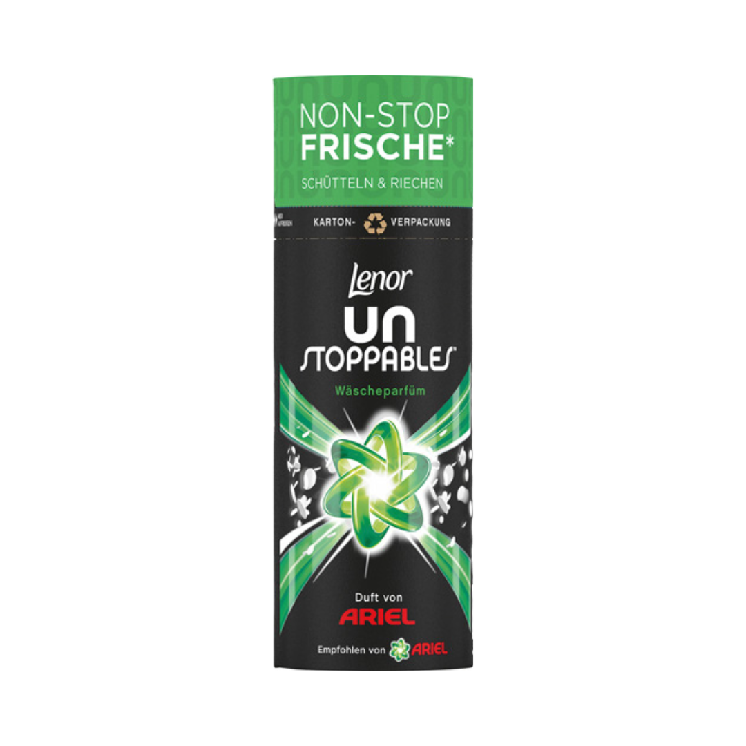 Entdecken Sie Lenor Unstoppables Wäscheparfüm für den nonstop Frischekick auf der Wäsche. Lenor Unstoppables verleiht Ihrer Kleidung im Schrank bis zu 12 Wochen lang einen frischen Duft. Der Duft von Ariel überzeugt mit einem sauberen, frische Duft passend zum Ariel Waschmittel. Einfach bei jeder Wäsche direkt in die Trommel geben und nach gewünschter Duftintensität dosieren. Das Lenor Unstoppables Wäscheparfüm ist in einer feuchtigkeitsbeständigen Kartonbox erhältlich, die nach Gebrauch im Altpapier recycelt werden kann.