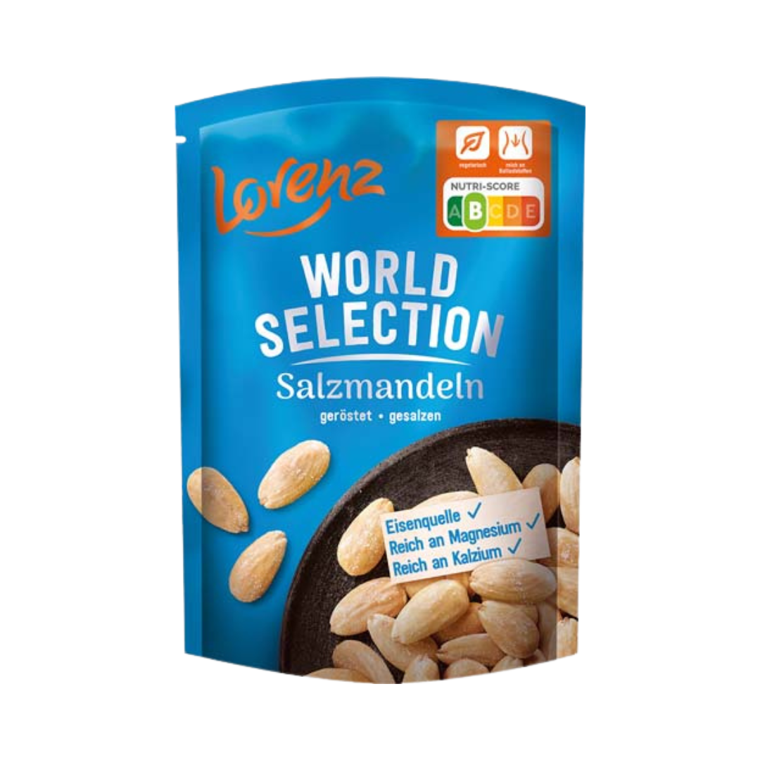 Mandeln, trocken geröstet und gesalzen Unter Schutzatmosphäre verpackt. WARNUNG: KLEINE KINDER KÖNNEN AN NÜSSEN ERSTICKEN.