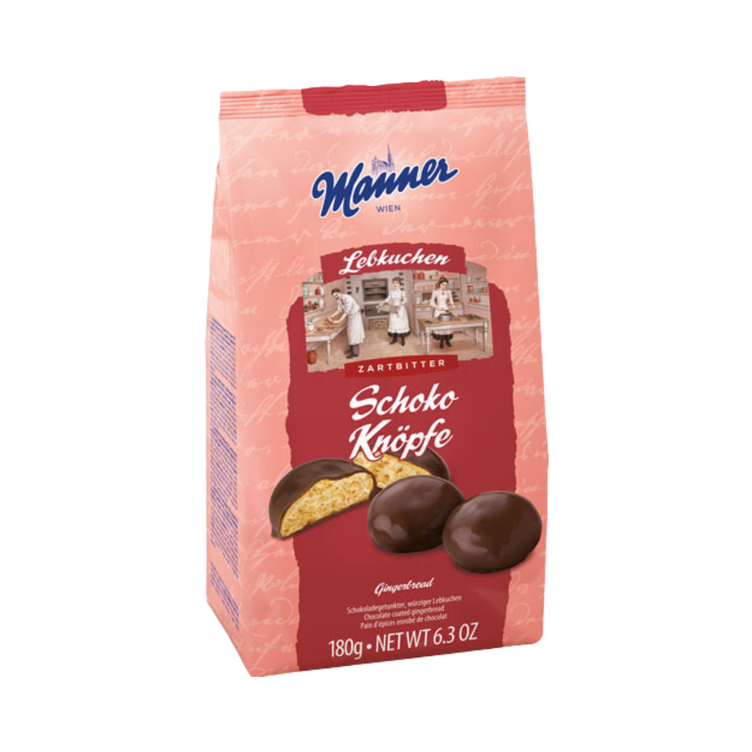 Die schokoladegetunkten Lebkuchen Knöpfe werden im Hause Manner in langjähriger Tradition und mit ausgesprochener Liebe zum Produkt hergestellt. Spezielles Augenmerk wird dabei auf die traditionelle Rezeptur des Lebkuchenteigs gelegt, der für die reichhaltigen Aromen und die saftige Konsistenz verantwortlich ist.