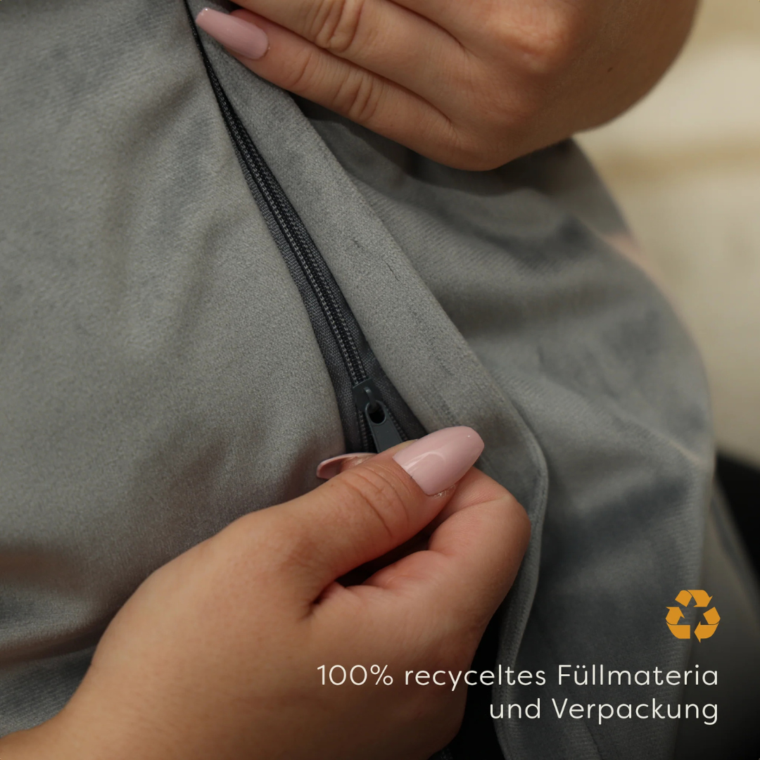 Der weiche Plush-Stoff hat eine luxuriöse Optik und ist in sechs verschiedenen Farben erhältlich. Bei Pleafs® sind wir überzeugt, dass Nachhaltigkeit und Komfort Hand in Hand gehen können. Deshalb ist das Kissen mit 100 % recycelten Materialien gefüllt und verpackt.