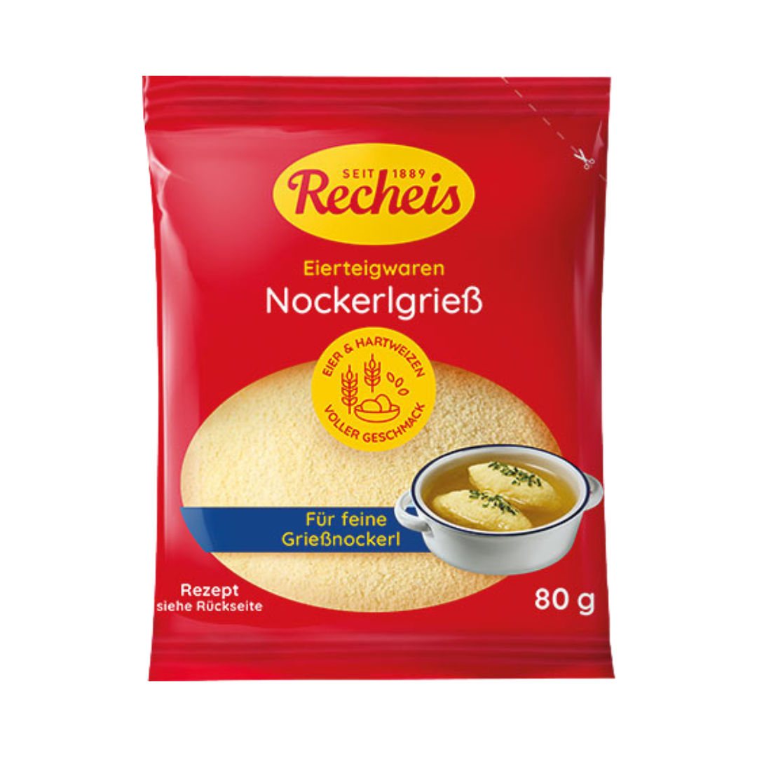 Sieden - Zubereitung der Speise in kochendem Wasser KOCHANLEITUNG: 80 g Recheis Nockerlgrieß 30 g weiche Butter 1 frisches, mittelgroßes oder großes Ei 1 Prise Salz Die Butter schaumig schlagen. Mit dem Ei und einer Prise Salz verrühren. Nockerlgrieß dazugeben und gut vermischen. 3-5 Min. rasten lassen, Nockerl formen, in mäßig kochendes Wasser einlegen und 12 Min. köcheln lassen. Anschließend Topf von der Platte nehmen und 5-8 Min. ziehen lassen. TIPP: Eier und Butter vor Verwendung auf Zimmertemperatur bringen. |