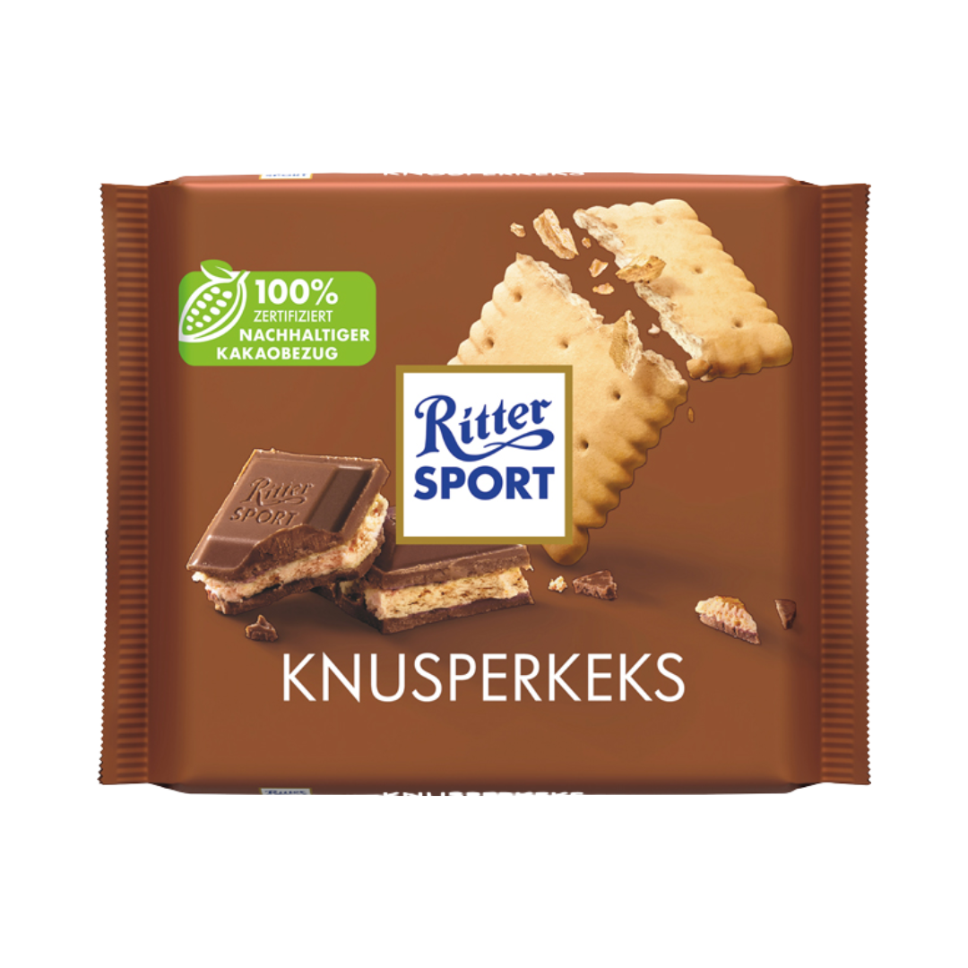 DA BLEIBT KEIN KRÜMEL ÜBRIG. In unserer RITTER SPORT Knusperkeks steckt ein echtes Unikat ein quadratischer Butterkeks. Speziell für diese Tafel wird er mit einer Extraportion Butter gebacken und anschließend passgenau in seine Hülle aus Kakaocreme und knackiger Vollmilchschokolade eingelegt. Fast zu schade, ihn zu essen. Wie gesagt: fast. 100% zertifiziert nachhaltiger Kakaobezug