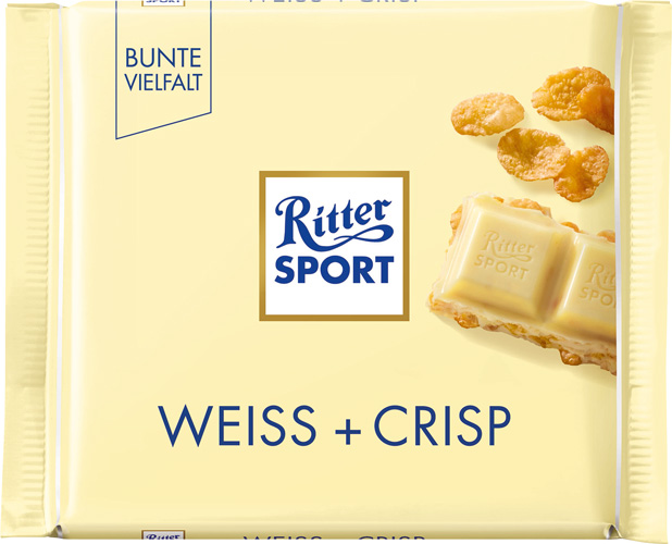 Weiße Schokolade mit Cornflakes (6 %) und Reis-Flakes (6 %).