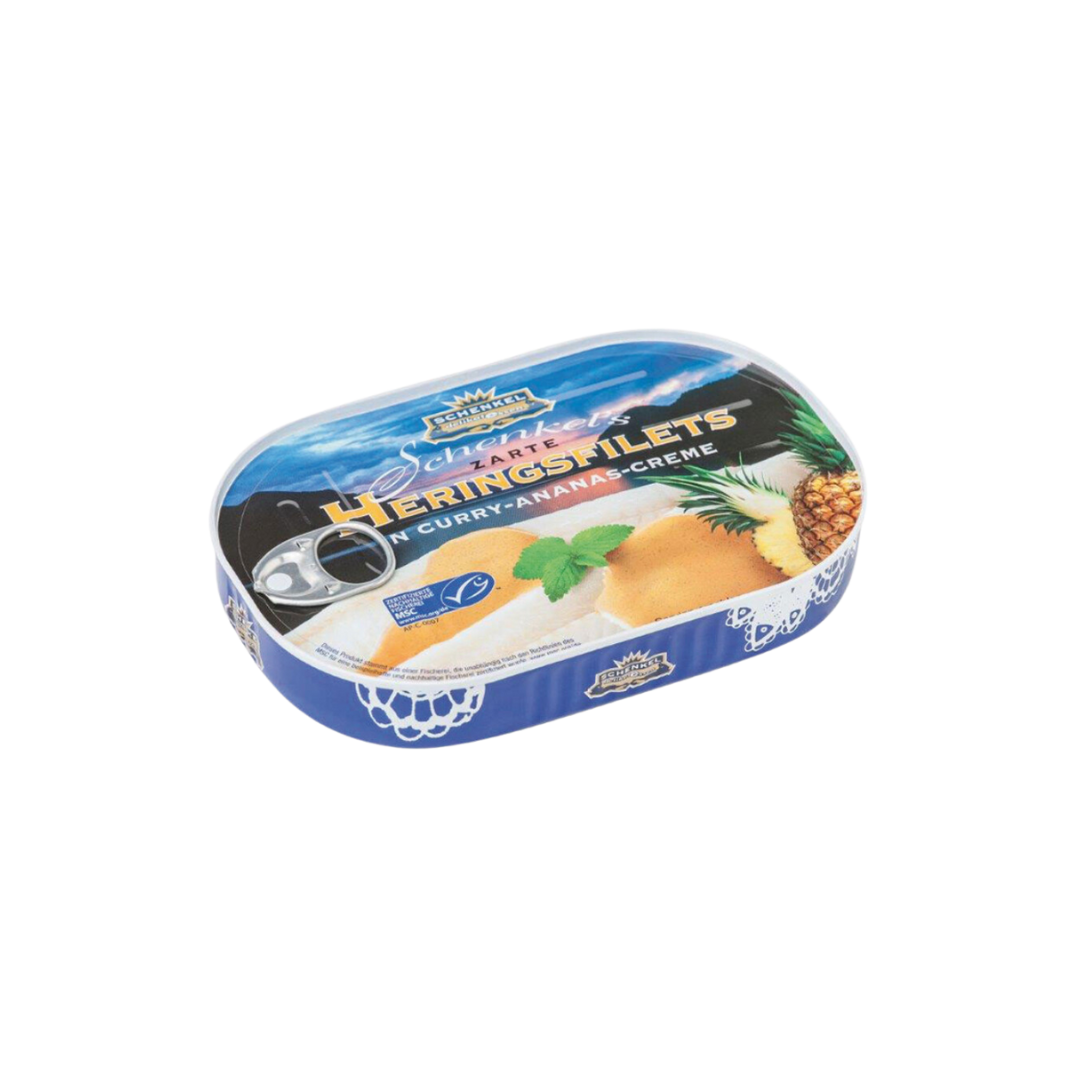 HERINGSFILETS (Clupea harengus) (55%), Trinkwasser, Ananaswürfel (10%), Rapsöl, Ananassaft (3,5%), Zucker, Curry (enthält SENF) (0,9%), Mango-Chutney (Zucker, Mango, Branntweinessig, Speisesalz, Gewürze), Tomatenmark, Branntweinessig, Verdickungsmittel: Guarkernmehl, modifizierte Maisstärke, MAGERMILCHPULVER, Sherry (enthält SULFIT), Speisesalz, Maltodextrin, Dextrose, Gewürze, Sojaöl, Aroma. |