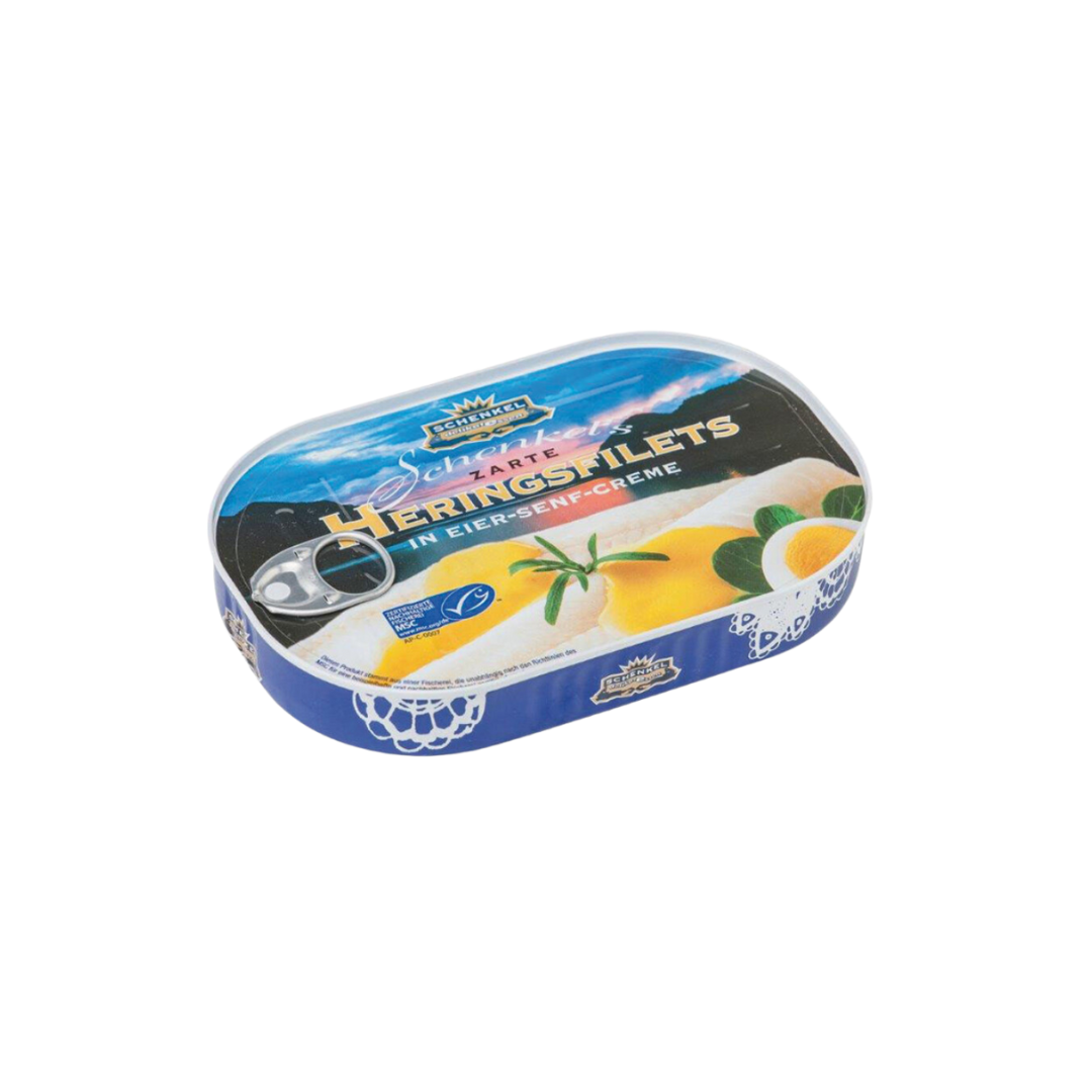 Zutaten: HERINGSFILETS (Clupea harengus) (60%), Trinkwasser, Rapsöl, SENF (Trinkwasser, SENFSAATEN, Branntweinessig, Speisesalz, Gewürze) (6%), Zucker, EIGELB (0,7%), MAGERMILCHPULVER, SAHNE, Branntweinessig, Verdickungsmittel: Guarkernmehl, Speisesalz, Maltodextrin, Dextrose, Sojaöl, Gewürze, Aroma. |