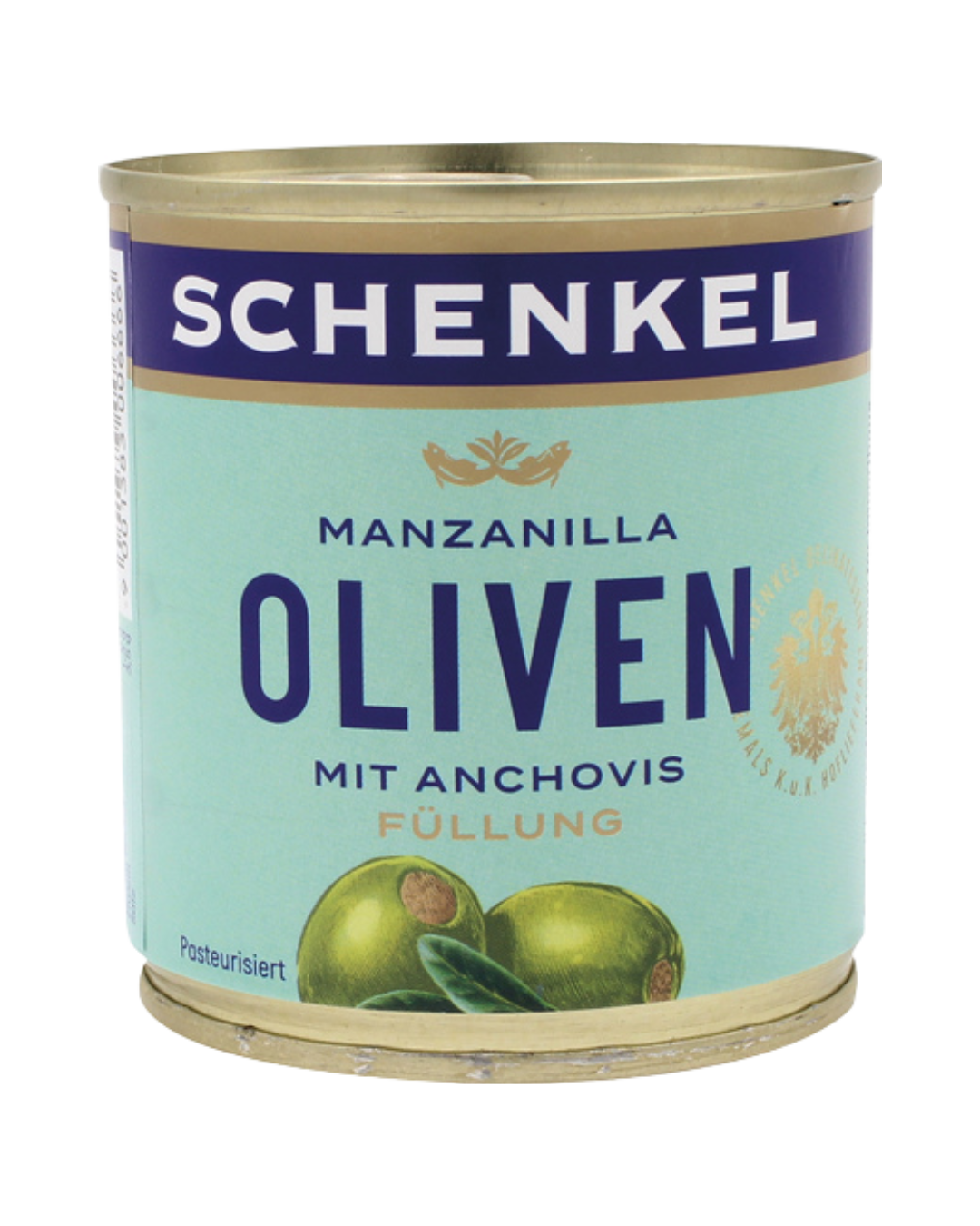 Schenkel Oliven "Manzanilla" grün, gefüllt mit Anchovis, aus Spanien, 85g (Abtropfgewicht)