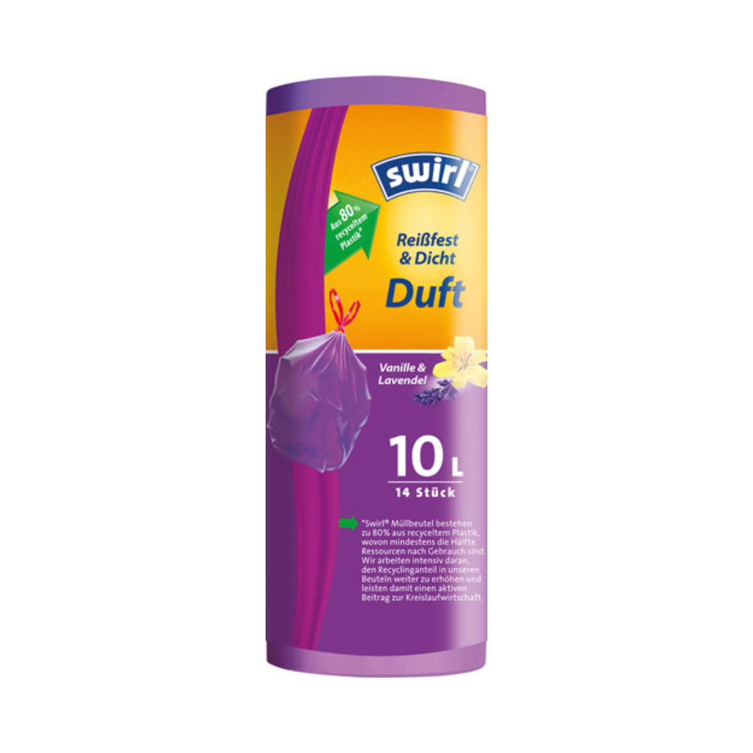Swirl Duft-Müllbeutel Reißfest & Dicht 10 Liter Vanille & Lavendel, mit Zugband, violett/blickdicht, 40 x 40 cm, aus 80 % recyceltem Plastik, 14 Stück