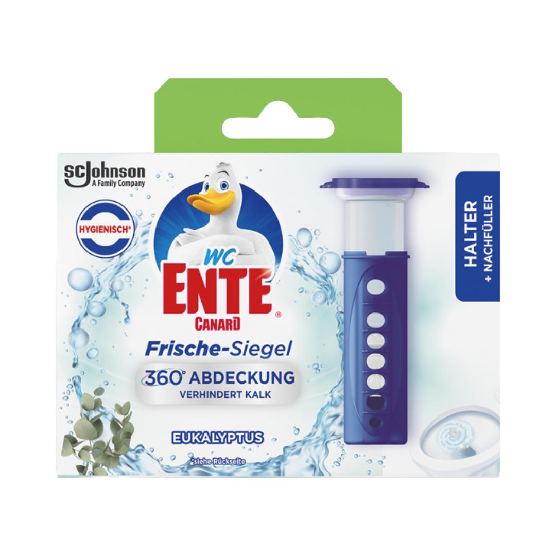 WCEnte FrischeSiegel Starterpack (1 Original Spendergriff plus 1 Nachfüller mit 6 Siegeln) ist die innovative und dezente Alternative zum klassischen WCEinhänger. Das FrischeSiegel ist das erste FrischeGel für die Toilette ohne Toiletteneinhänger. Deswegen ist der Toilettenreiniger sowohl für Toiletten mit Spülrand als auch für spülrandlose WCs geeignet. Das WCGel an der Innenwand des WCBeckens wie ein Siegel/Stempel platziert. Es setzt reinigende Substanzen und frischen Toilettenduft bei jeder Spülung frei. Einfache Anwendung: Verschlusskappe abnehmen, den Spender mit dem offenen Ende mit etwas Druck an der Innenwand des WCBeckens platzieren, Druckknopf drücken und den blauen Spendergriff vorschieben, bis der Druckknopf wieder einrastet. Den Spender einfach abziehen und das Frische Siegel haftet im WC Becken. Verschlusskappe wieder aufbringen. 1 Siegel hält bis zu 10 Tage bzw. 1 voller Spender mit 6 Siegeln bis zu 8 Wochen. Auch in Toiletten mit NanoVersiegelung oder LotusEffekt anwendbar.